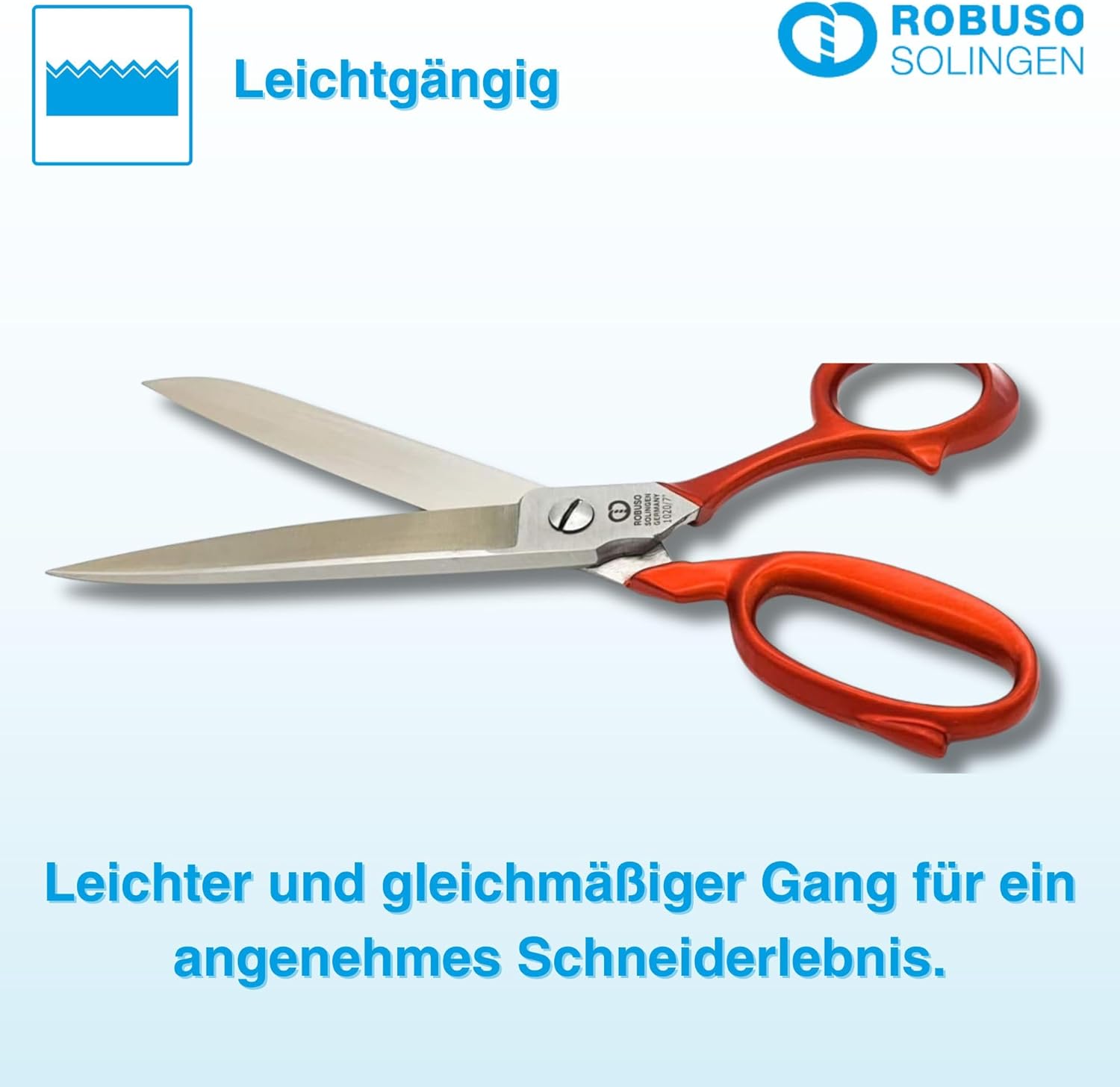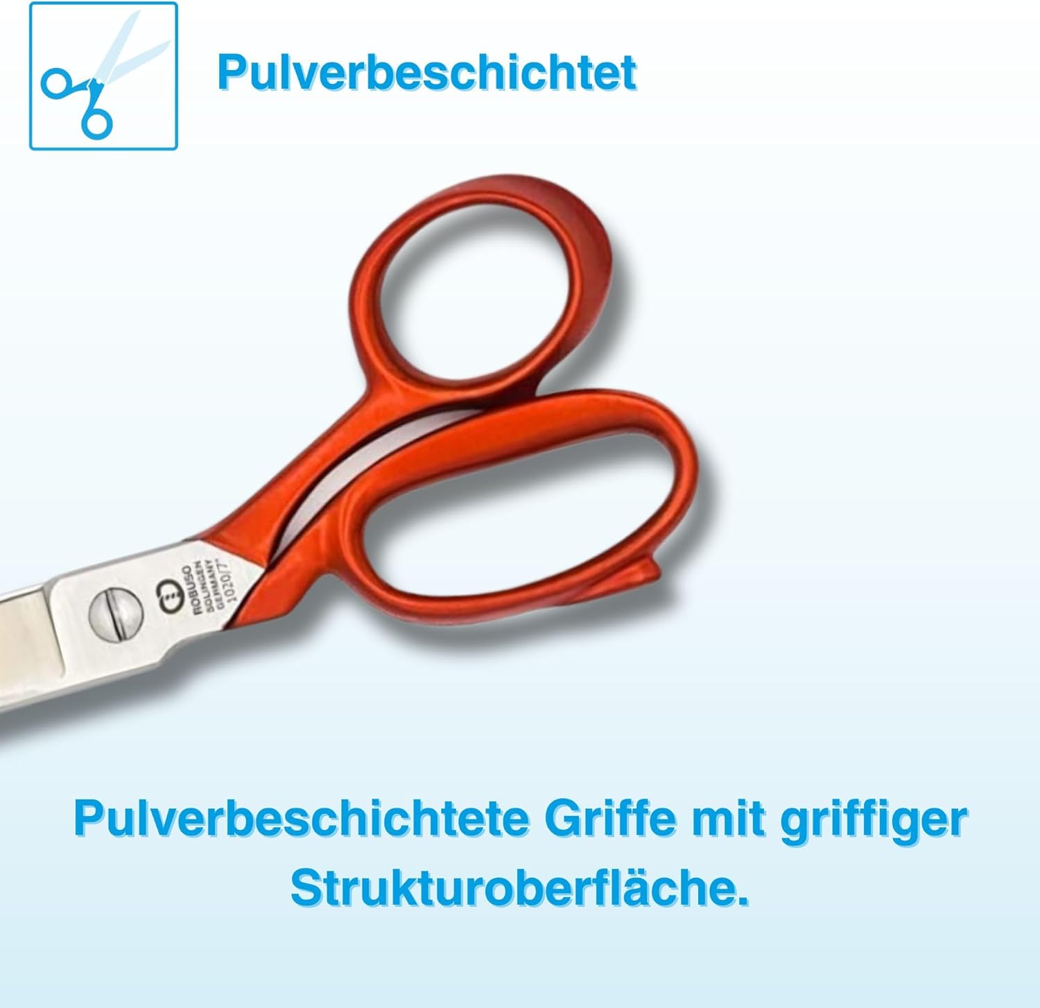The ROBUSO Tailor's Shears in Master Quality are our classic model. They are characterized by the firmness of the screw, smooth operation, and consistent cutting power from the base to the tip. They are especially appreciated for their long lifespan and precise cutting of thin and thick fabrics. Our tailor's shears also feature powder-coated handles with a textured surface for a comfortable grip, high impact resistance, and improved resistance to heat, sweat, and moisture.